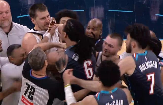雷霆球员杰林冲上去帮队友多尔特出头,他与约基奇推搡互相撕扯球衣,双方多位球员围拢在一起爆发冲突。